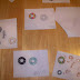 A towel cake with kitchen utensils and dishclothes. Has spatulas, ice cream scoop, timer, peeler, salt and pepper shaker with vinyl letters. Ribbons around a couple of the layers and filled in with curly ribbons.