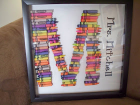 I found my frames at Walmart for $10. They are 12x12 shadow boxes. I used tacky glue to adhere the paper onto the cardboard backing and also used it to glue on the crayons. It's a little thicker than Elmer's glue and kept the crayons in place until they were dry. I used about 1 1/2 boxes of crayons for each letter - but it probably depends on what letter you are making.